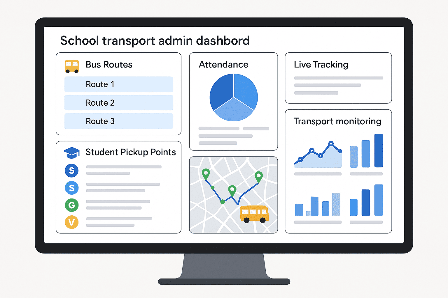 School administrators manage buses, routes, drivers, and student transport assignments from a centralized dashboard. The system allows real-time monitoring of buses, transport scheduling, and operational reporting.
