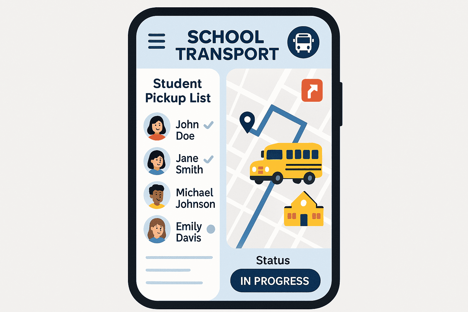 Drivers receive route assignments, student pickup lists, and navigation assistance through the mobile application. They can update trip status, record attendance, and manage daily transport trips efficiently.