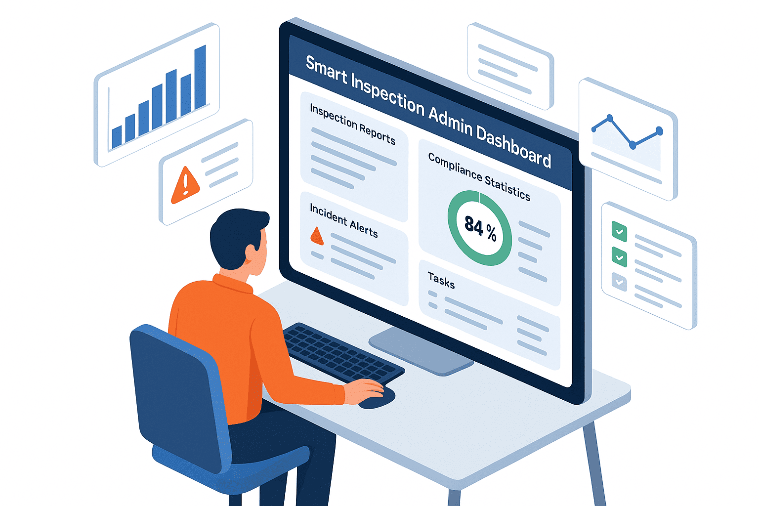 The Admin Dashboard acts as the central control center where administrators manage devices, inspection schedules, inspection templates, incident reports, and maintenance activities. The dashboard provides real-time visibility into inspections performed, pending inspections, device health status, and issue resolution progress across facilities.